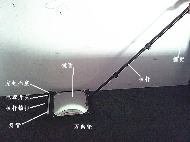 本产品是一款配备照明装置的车底检查镜,当环境光线不足时也能正常工作,不会影响到检查效果。采用大容量的可充电电池给照明灯管供电,可以大大的延长电池的工作时间,保证检查工作的顺利进行。随机配备的30*30CM方形凸面镜,增大了检查范围和角度,显著地提高工作效率和可靠性。